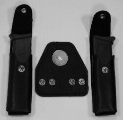 It is held in place by the dzus (twist) pin that attaches your saddlebag to your bike and consists of the docking station, two removable magazine pouches and a replacement washer. The pouches may also be used to hold flashlights, buck knives or leatherman tools but is designed as a mate for our holster kit (sold separately)